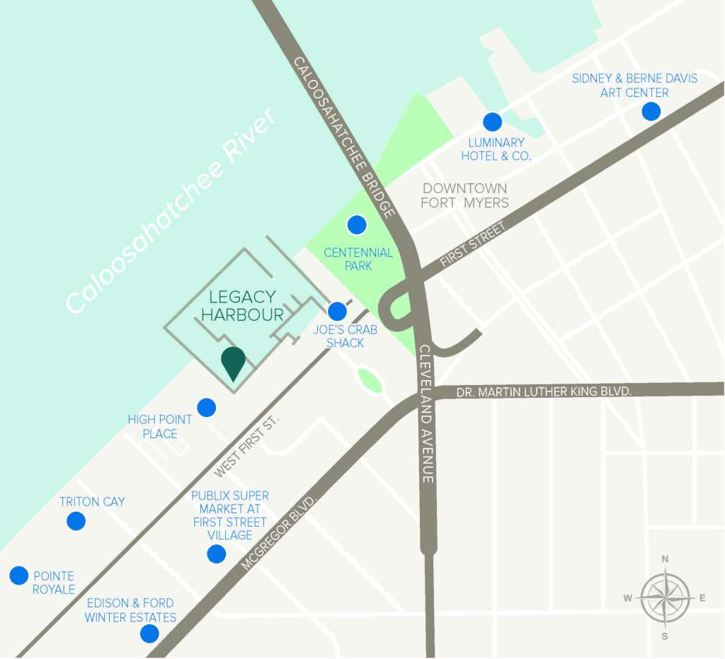 Welcome to Legacy Harbour, a mixed-use community envisioned for the heart of downtown Fort Myers. Here you can sip a cup of coffee overlooking the Caloosahatchee River, stroll the promenade after an afternoon in downtown Fort Myers, or grab a late-night bite after a day on the water…